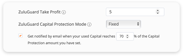 Ví dụ: Bạn đặt mức Bảo vệ vốn ZuluGuard là $1500 và bạn đặt tùy chọn nhận thông báo ở mức 50%. Nếu vốn đã dùng đối với Nhà giao dịch của bạn đạt 50% (- $750) trong tổng mức Bảo vệ vốn bạn đã đặt ($1500), thì bạn sẽ nhận được một email mời bạn theo dõi chặt chẽ tài khoản của bạn và Cài đặt ZuluGuard đối với Nhà giao dịch này.